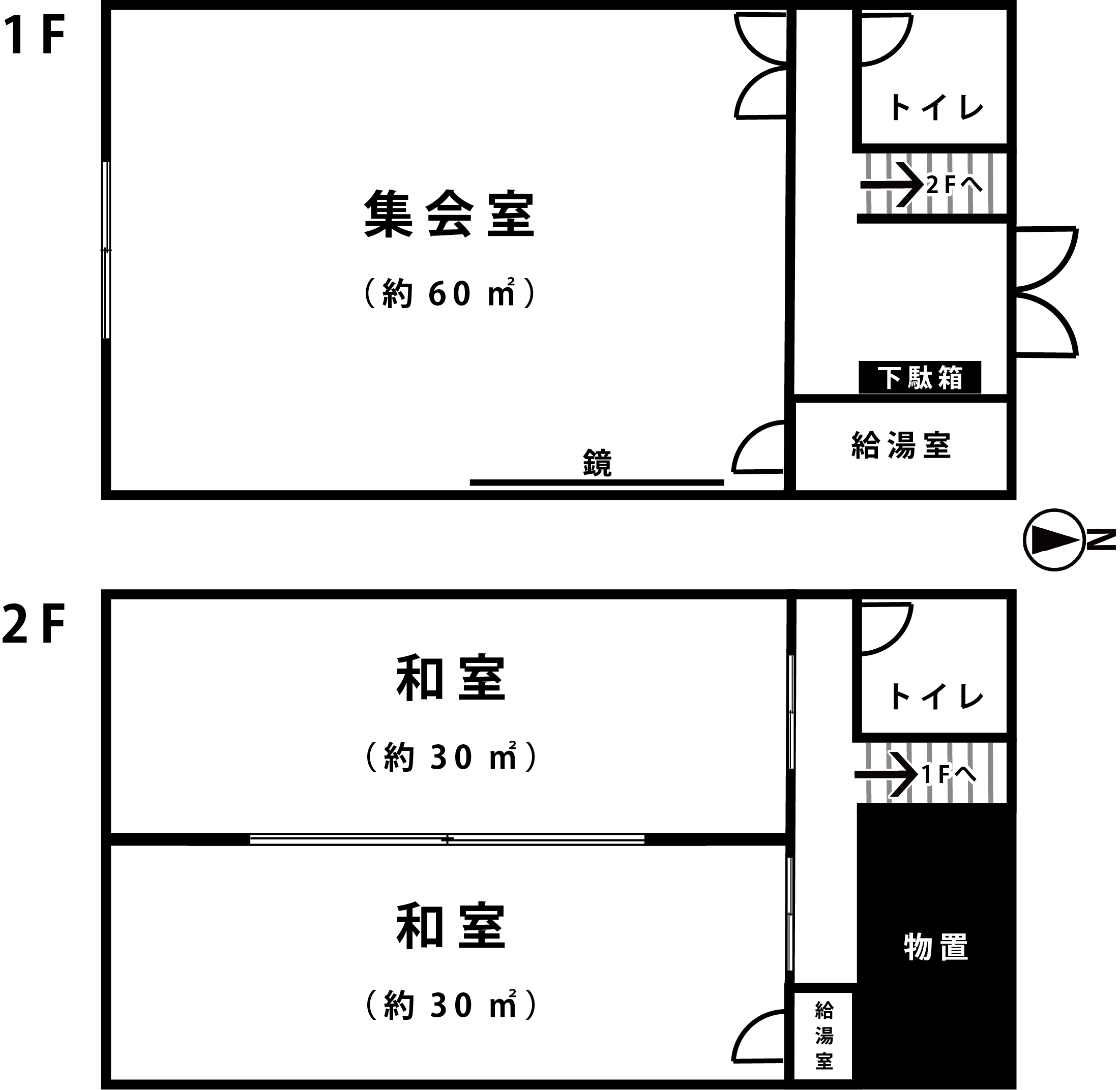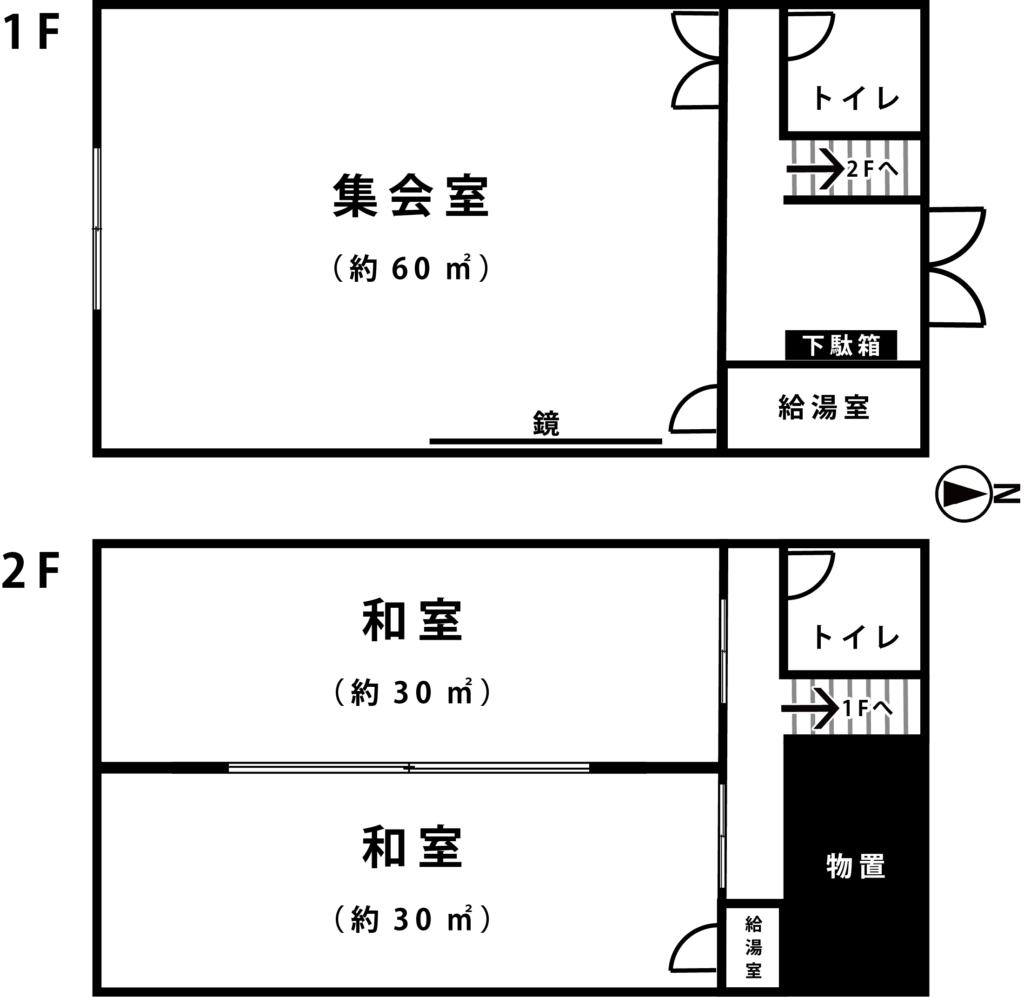 施設設備:1階 集会所(約60㎡)・2階 和室 2部屋(各約30㎡)